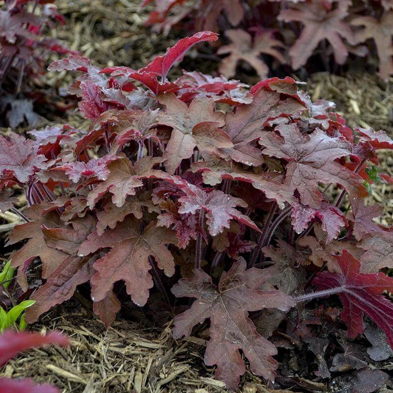 - Coppery red, heavily lobed foliage.